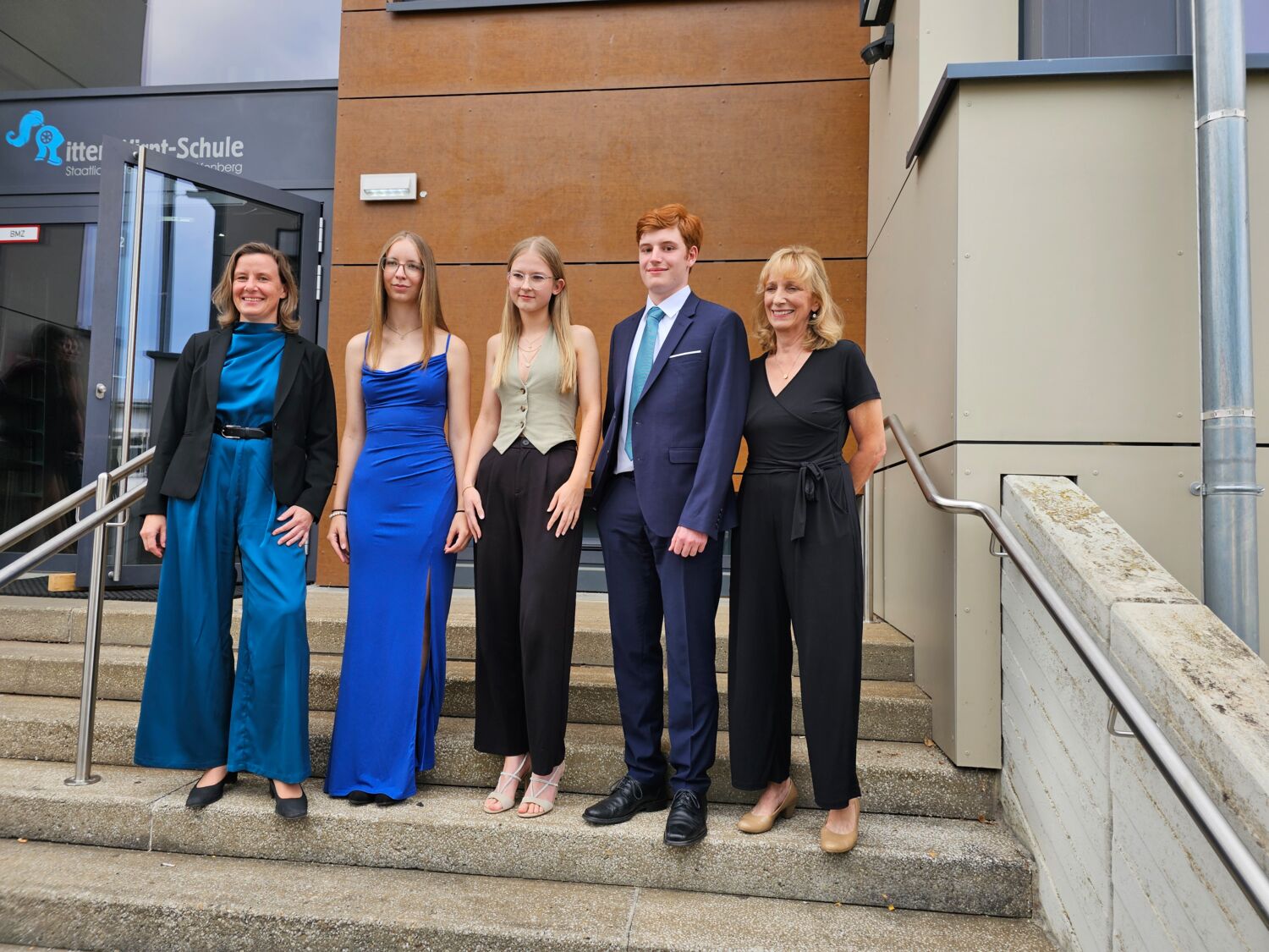 Am 25.07.2025 erhielten die Absolventinnen und Absolventen der Realschule Gräfenberg ihre Abschlusszeugnisse. Dabei wurden die drei Jahrgangsbesten Schülerinnen und Schüler besonders geehrt (v.l.n.r.): Frau Martina Steger, Elternbeiratsvorsitzende, Rufft, Jasmin 1,18, Klasse 10B, Lehmeier, Lisa 1,25, Klasse 10D, Lemberger, Jakob 1,20, Klasse 10A,, Frau Gertrud Eismann, Realschuldirektorin