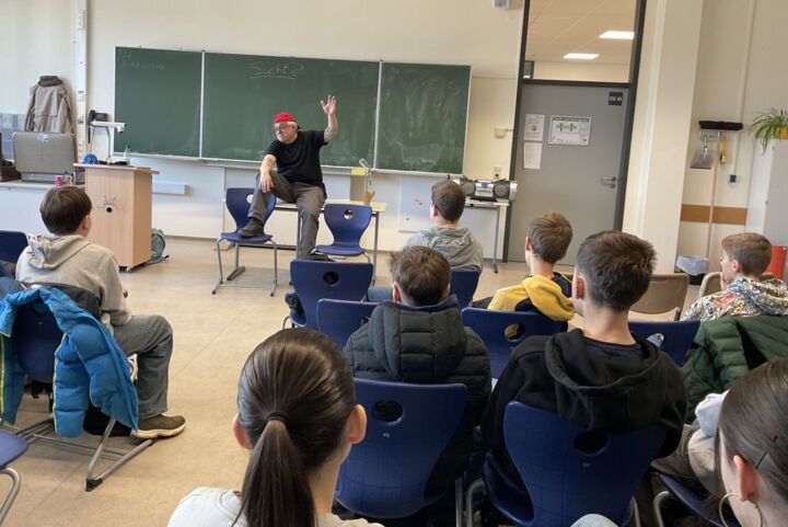 Auch in diesem Schuljahr konnten wir den Theaterpädagogen Dirk Bayer an unserer Schule begrüßen. In einer zweistündigen Vorstellung des Stücks „… bis zum bitteren Ende/Illegal highs“ setzte er sich zusammen mit unseren siebten Klassen mit dem Thema Sucht und Drogen auseinander. Dabei schlüpfte er in verschiedene Rollen, wie den betrunkenen Fußballfan oder den Partygänger, der munter bunte Pillen verteilt. Besonders viel Nachklang fand jedoch die Rolle des 16-jährigen Kevin, der so lange zu viel Alkohol trank, bis er auf einer Klassenfahrt aufgrund einer Alkoholvergiftung ins Krankenhaus eingeliefert wurde.