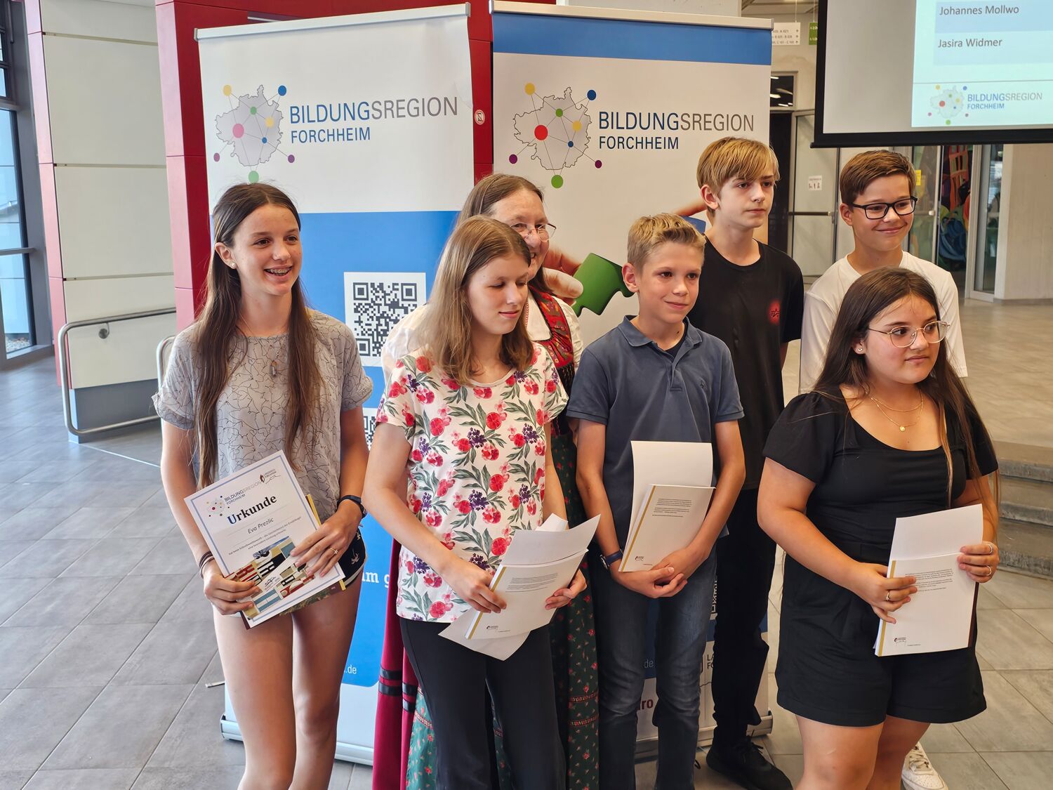 Bei der Preisverleihung der Erzählkugel 2025, einem Schülerwettbewerb des Landkreises Forchheim war auch Luiza Dragu aus der Klasse 5C unter den Gewinnern. Begleitet von ihrer Familie und der betreuenden Deutschlehrkraft Frau Susanne Gumbmann durfte Luiza nicht nur ihren Preis entgegennehmen, sondern erhielt auch ein kleines Buch mit allen Schülertexten des Wettbewerbs, darunter ihr eigener, überreicht (Bild: ganz vorne rechts).
